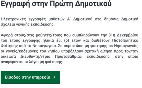 που διέπει την εγγραφή στην πρώτη δημοτικού.